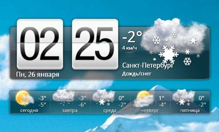 New Weather - это погодный информер с перекидными часами и различной графикой для отображения текущего состояния погоды. Данные о прогнозе погоды предоставляются FORECA с помощью сервиса Яндекс.Погода